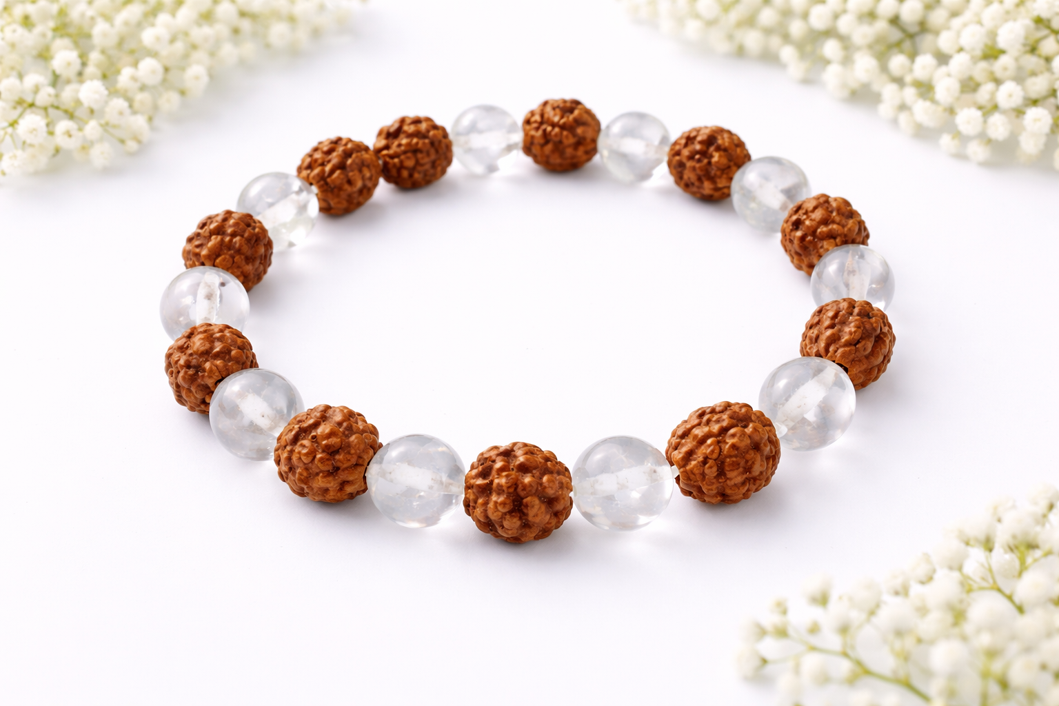 Elevate your spiritual journey with our authentic 5 Mukhi Rudraksha & Clear Quartz Crystal Bracelet, a powerful fusion of sacred Himalayan Rudraksha beads and high-vibration clear quartz gemstones. Designed for daily wear and deep energetic healing, this bracelet harmonizes mind, body, and soul while creating a protective aura around the wearer.